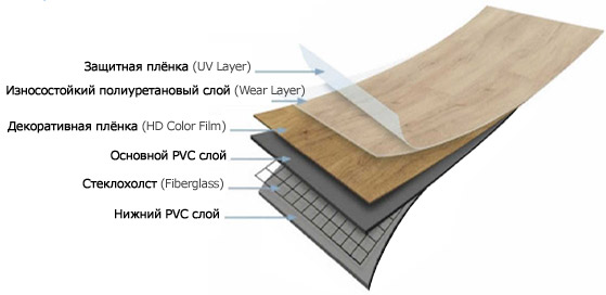 с реалистичным дизайном «под камень», «под дерево» или «под ковёр». - Основного PVC слоя (Base) с добавлением кварцевого песка, что создаёт прочную основу напольного покрытия.